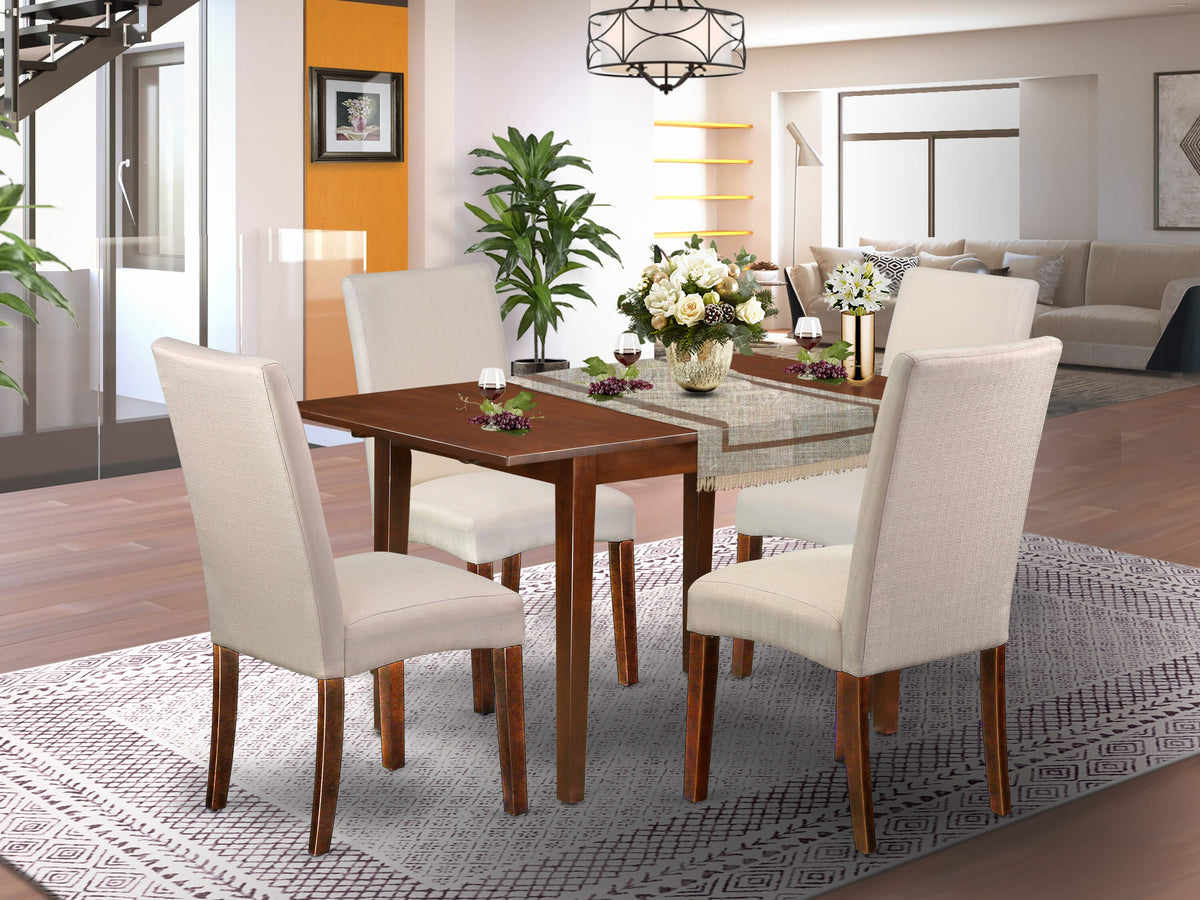NODR5-BOJ-Y0 5-Piece Dining Set with Rectangular Butterfly Leaf Table and Cream Linen Chairs, 32x54 Inch, Mahogany Hue