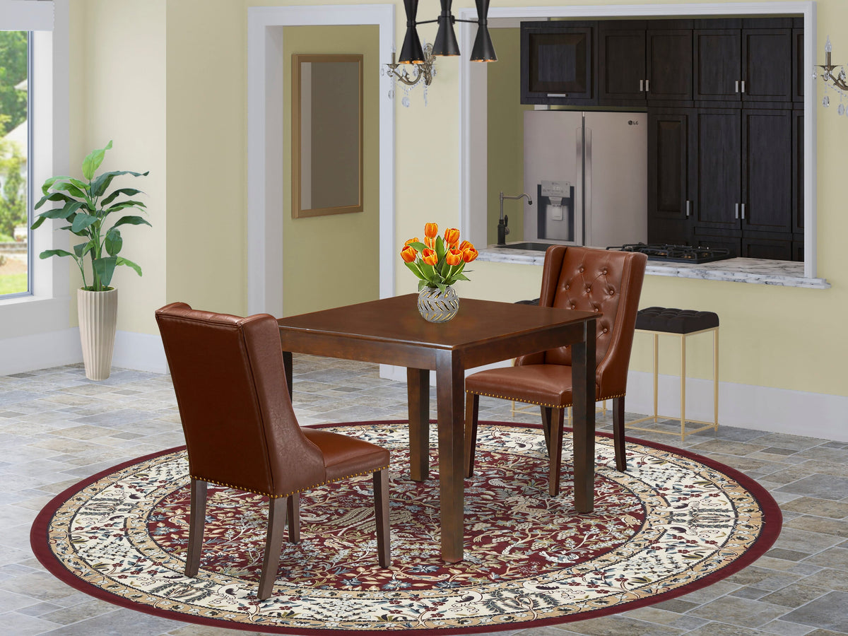 OXFO3-WK4-DJ Set with Square Table & 2 Brown Leather Parson Dining Chairs for Dining Room, 36x36, Mahogany