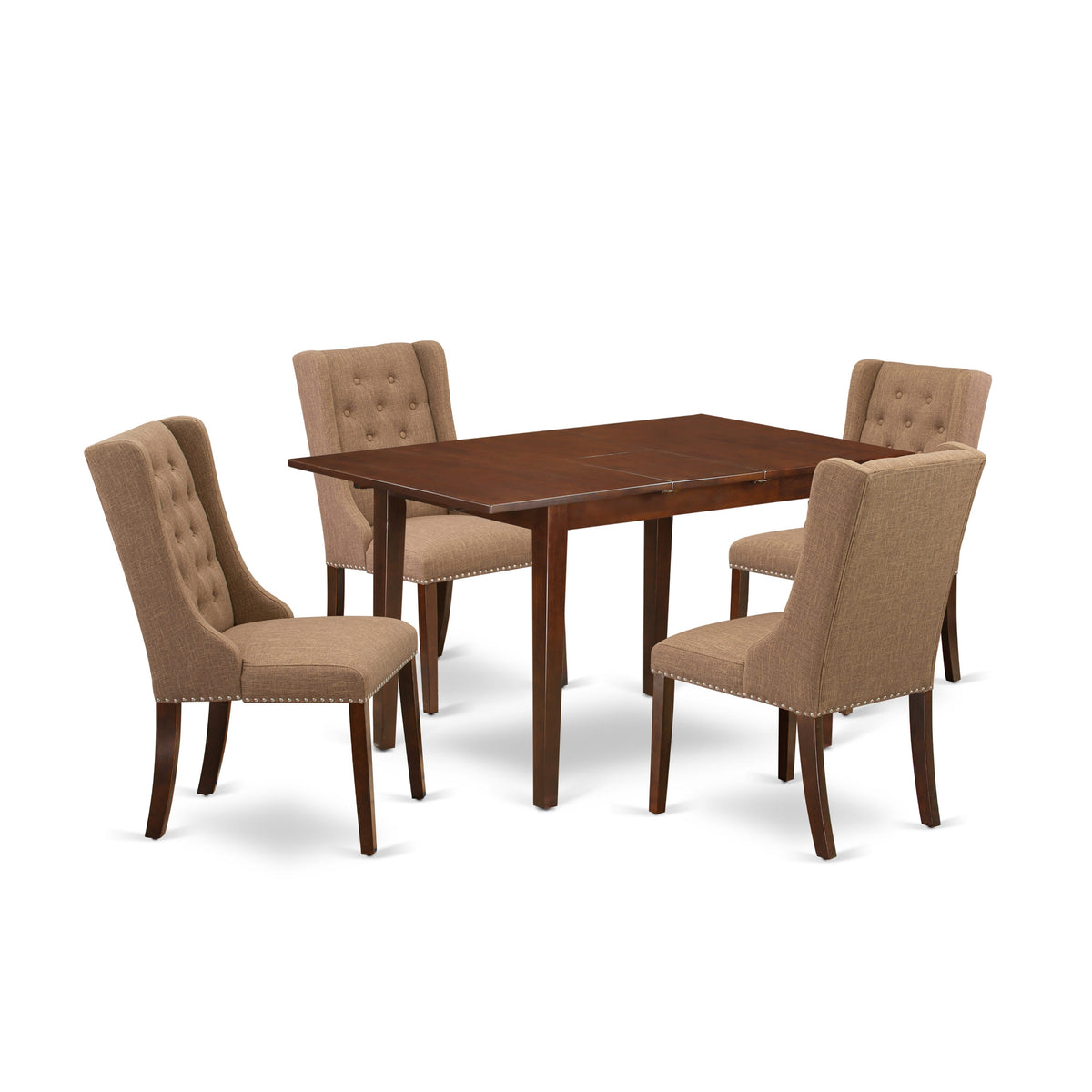 Our attractive 5-Piece dining room set can help any dining room look more beautiful. Our kitchen dining room set includes 4 attractive parsons dining room chairs and an excellent 12-inch self-storage expansion leaf dining table. This kitchen dining room set will increase the elegance of any dining room with its ageless style. Our kitchen chairs are good quality linen fabric, which complete comfort and a great sitting experience. This modern butterfly leaf dining table has a rectangular tabletop and wooden legs. These nailhead parson dining chairs have Light Sable Linen Fabric and Mahogany Solid wood chair legs. These beautiful kitchen chairs create a warm, inviting atmosphere. It will bring elegance to the home and perfectly blend into any home decor. Our innovative dining table set is created from good quality Rubber Wood. These parson dining chairs and the modern kitchen table is easy to assemble. Our dining set is assembled according to the assembly instructions, which are included in the package.