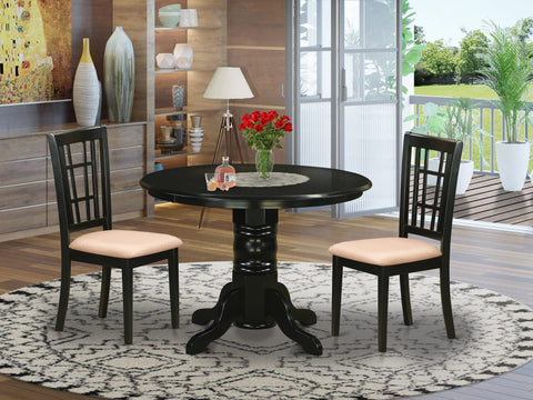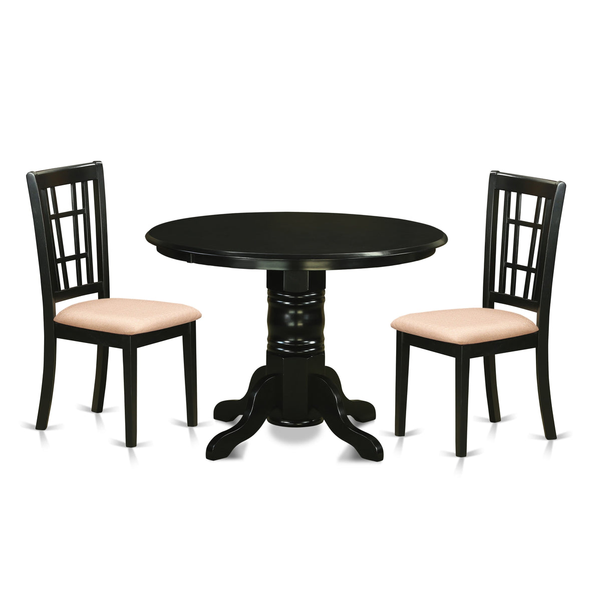 Explore SHNI3-S3U-O 3-Piece Set with Pedestal Table & Linen Upholstered Chairs - Perfect for Compact Dining Areas, 42x42