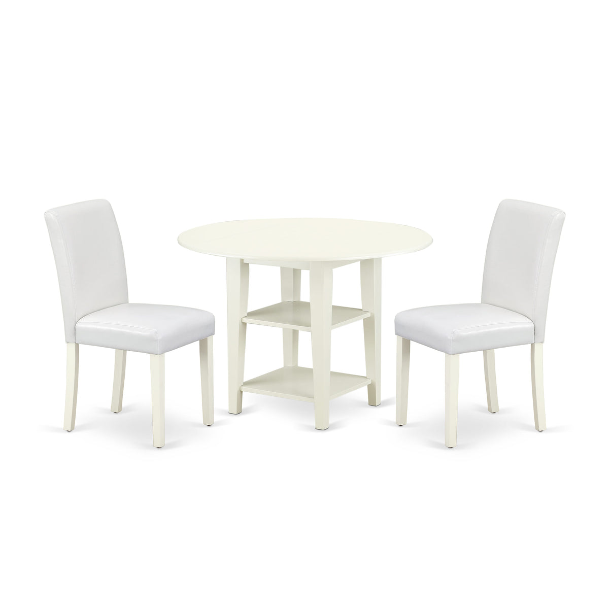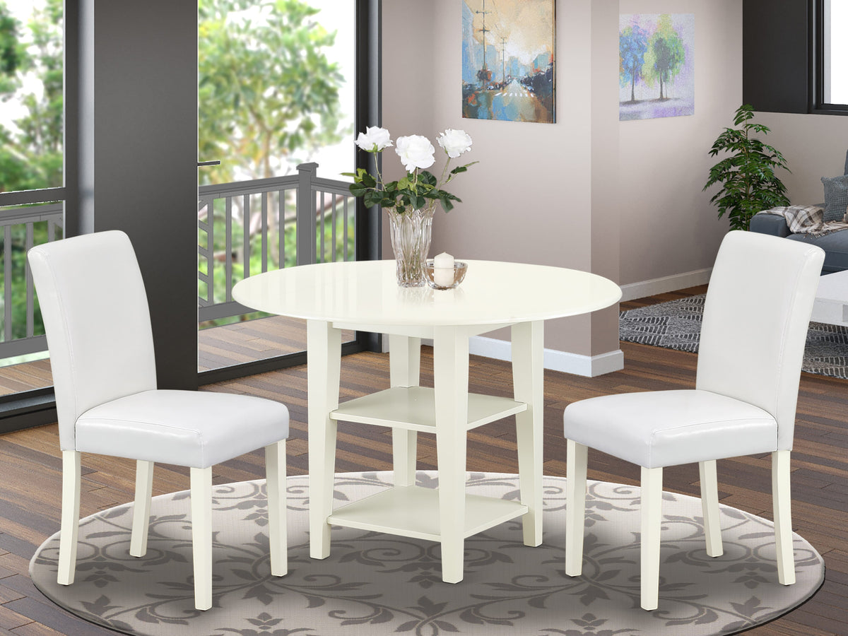 Give your room decor a new and polished look with this modern dining set. Class meets beauty With the Sudbury two-drop leaf Dinette table. This functional dining table piece can be your room's focal point, featuring two shelves below the table. This dining table is finished in an elegant Linen White. You can decorate its surface with your favorite decor, but this table is just as happy standing pretty on its own. This spectacular slick kitchen table makes a really good addition for all kitchen spaces and corresponds to all sorts of dining-room concepts. No heat-treated pressured wood like MDF, particleboard, or veneer top was fabricated. This simple but charming parson chair will add ambiance and style to your dining room. A contemporary twist on a classic design, this eye-catching design will liven up any look. The traditional parson gives this chair a touch of familiar charm, while the PU leather-white color and clean-lined design Elevate this chair with a modern flair. Replacing the old dining set with this one, you can effortlessly refresh your dining space. The Dinette chairs are engineered to offer a great amount of comfort to your spine and thus reduce the chances of back pain. The standard shape, size, and design make the dining area significantly attractive. This durable and comfortable dining set can be a good choice for a great dining experience with family and friends.