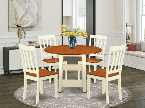 This 5-piece dinette set includes 4 kitchen chairs and a dining table. These dining chairs have a Wooden Seat, and a Slatted Back and the kitchen table consists of 2 shelves, drops leaf round Top and 4 legs. It increases the grace your dining room. We have crafted these mid century chairs and modern dining table with the help highly experienced carpenters, who develop a smooth and high-end finish to this dining room table set. This premium quality modern dining table set is ideal for you and any dining area. This dining room set can be used for casual home parties or intimate gatherings. We try to fer innovation as well as ease to put together. You can assemble a mid century table and wooden dining chairs quickly according to the instructions if you have any trouble feel free to contact us. Buy our products confidentially, because our 1st priority is to keep customers happy!