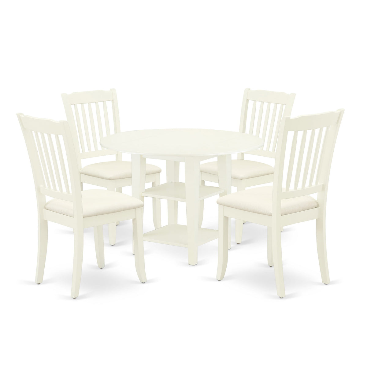 Decorate your dining room with this modern Dinette set to get a new and polished look. Class meets beauty With the Sudbury two drop leaf Dinette table. This functional dining table can be your room's focal point, featuring two shelves below the table. Made up of rubber wood, this sturdy wooden table is finished in luxurious Linen White. This small dining table requires very little space and it'd be a great choice if you are struggling with space in your dining area. This kitchen table makes a really great addition for all kitchen space and corresponds to all sorts of dining-room concepts. This eye-catching Danbury dining room chair offers a modern and sophisticated look. The kitchen chairs come with a Linen Fabric upholstery seat to fit personal preferences and perfect design. This stylish dining chair features curved front legs. Elegant Dinette chairs feature 7 vertical slats to give any dining area a touch of class and sophistication. Finished in luxurious Linen White color. The standard shape, size and design make the dining area significantly attractive. This budget friendly, Durable and comfortable Dinette set can be a good choice if you are looking for a great dining time experience with your family or friends.