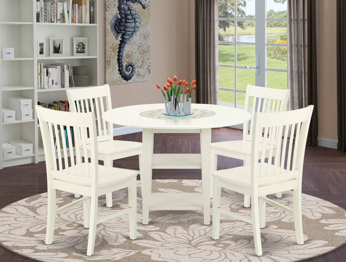 This 5-piece dinner table set includes 4 dining room chairs and a dinner table. These modern chairs have a Wooden Seat, a Slatted Back and the dinner table consists of 2 shelves, drops leaf round Top and 4 legs. It enhances the charm of your dining room. We have designed these dining chairs and dinner table with the help of highly experienced carpenters, who develop a smooth and high-end finish to this dinette set. This high quality dining room set is ideal for you and any dining area. This kitchen table can be used for casual home parties or intimate gatherings. We try to give innovation as well as ease to put together. You can assemble a modern table and dinner chairs quickly according to the given instructions if you have any trouble feel free to contact us. Buy our products confidentially, because our 1st priority is to keep customers happy!