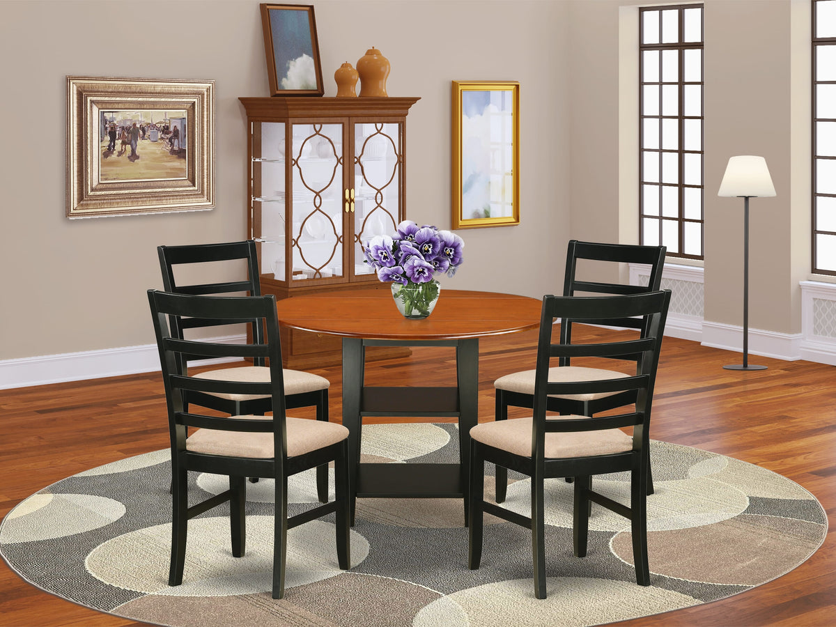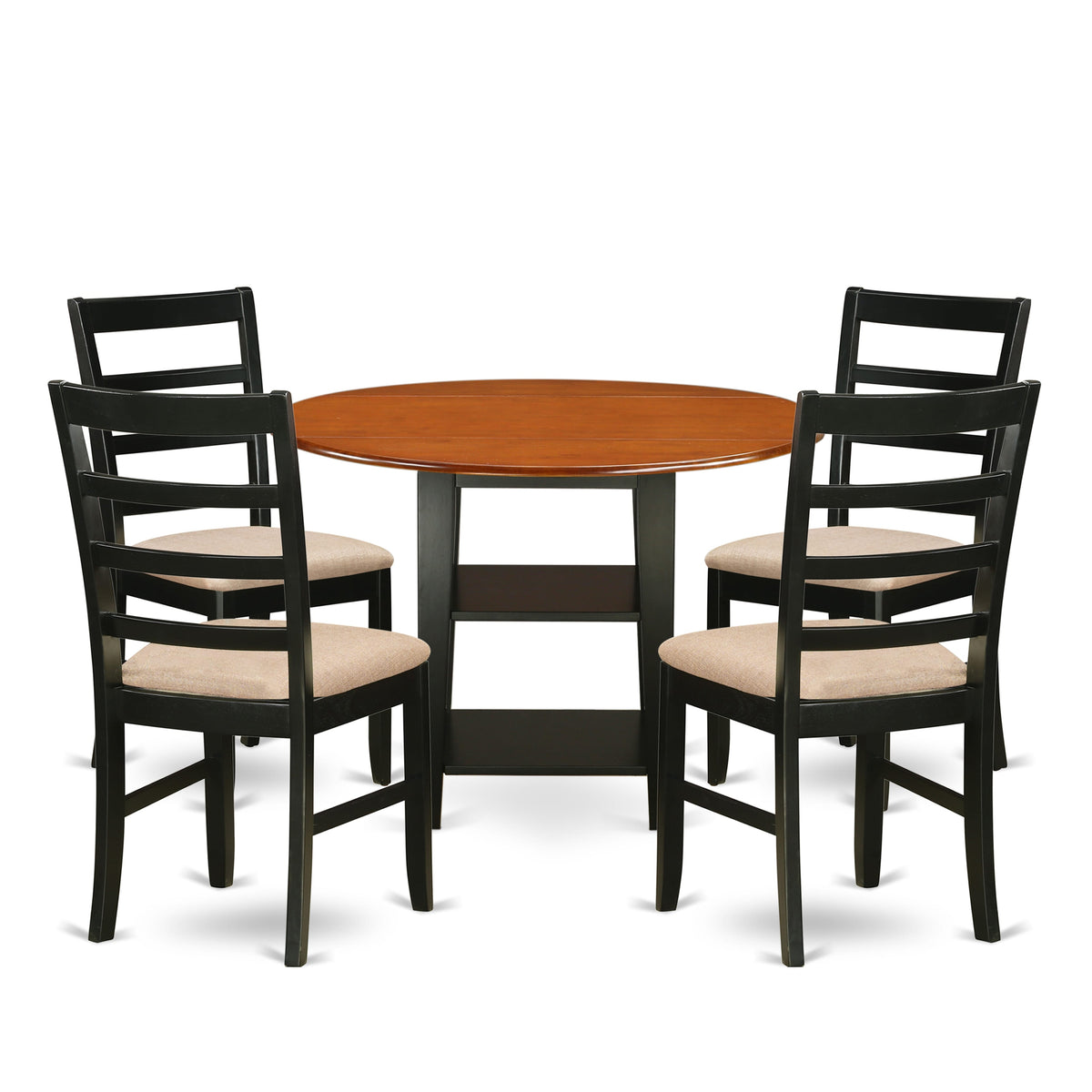 SUPF5-PW7-U 5-Piece Dining Ensemble Round Drop-leaf Table with Shelves & 4 Fabric Chairs, 42 in Black & Cherry