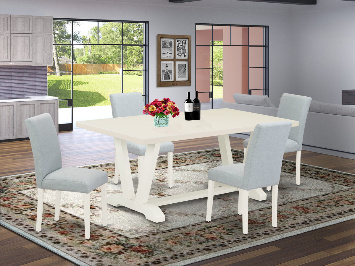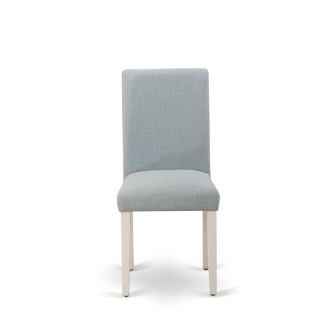 This dinette set includes 4 modern dining chairs and a kitchen table. This modern rectangular dining table has a rectangular top and beautiful legs. The dining room chairs have linen fabric seat and a stylish high back. The seat of our mid-century chairs offers a good sitting experience and a stylish high back to fit your Back Perfectly for the backrest. The kitchen chairs in this dining room consist of legs. The color of the kitchen chair seat is Baby Blue and the wooden legs are Wire brushed Off-White. The top color of the dining room table is Off-White and the wooden legs are Wire brushed Off-White. The dining room set is made of solid wood. This wood is also called rubber wood. This wood always gives durability and strength. This modern kitchen table and upholstered chairs give more balance with the help of legs because this is made of rubber wood. Make your completely wooden dining table set stronger. You can use this dinette set for a long time. You can move our mid-century modern chairs under the wooden dining table when you finish your meal. Easy to assemble these mid century dining chairs and a modern dining table. You only need to take about 30-40 minutes to assemble each dinette set. This kitchen dining table set comes with all the necessary tools. This dining table set clean easily because this kitchen table set design has smooth. You can easily clean this set with any brush and dust cleaner cloth. You can clean this dinette set within a few minutes. This modern dining table set is matches any room décor because of its style. This dining room set offers an always-fresh look and attracts any person who comes to your home.