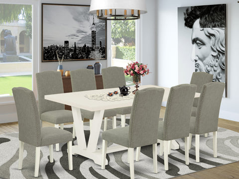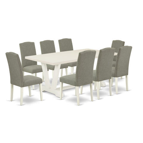 Take your kitchen or dining area to the next level with our innovative style dining set. Including 8 High back upholstered dining chairs with slightly curved angles throughout, in a bright colored finish. The dining room table features a traditional style with painted, fresh Off-White finish legs for a simple, yet a classy table. Enjoy meals with your family, with this classy modern dining table set. The chair is covered with breathable Linen Fabric to provide a comfortable touch. High back kitchen chairs with copper nails around appear noble and classy. This listing has a premium color of Off-White finish for the dining room table top and Dark Shitake Finish Parson Chair of Stylish back. Our lovely premium colors increase the beauty of your dining area and give a luxurious look to your dining area or kitchen area. East West Furniture is always manufactured from modern furniture along with easy construction parts. We try to keep our furniture parts modern as well as simple. Our high class dining set is best for your gorgeous dining area as well as the kitchen. Our dining room set is the perfect complement to your home! Give your guests the best seat in the house. Enjoy with East west Furniture!