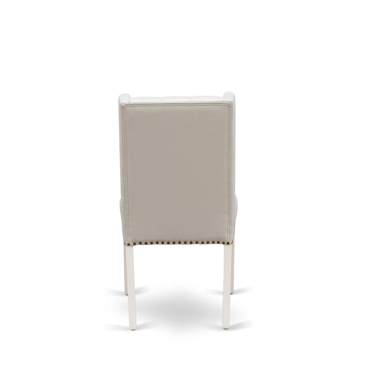 Our gorgeous 5-Piece dining room table set is going to make your family mealtime more comfortable and pleasant! Our 5 Piece dinette set includes 4 parson chairs and 1 modern dining room table. These Button tufted chairs' back are slightly and elegantly curved, expertly finished with PU Leather soft upholstery. Our parson dining room chairs seat is created from PU Leather that offers a wonderful sitting experience. This modern kitchen table has a rectangular Linen White tabletop and Wire Brushed Linen White V-Style Legs. These nail head kitchen chairs have White PU Leather and Linen White solid wood chair legs. These mid century dining chairs stand on a sturdy hardwood frame with solid legs and a contemporary Linen White finish. Designed with easy and fast assembly in mind, each set comes conveniently flat packed with easy-to-follow instructions and all necessary tools included. This contemporary, budget-friendly, durable and comfortable dining room set furniture can be a great choice for you and your family if you enjoy the dining experience. Enjoy with East West Furniture!