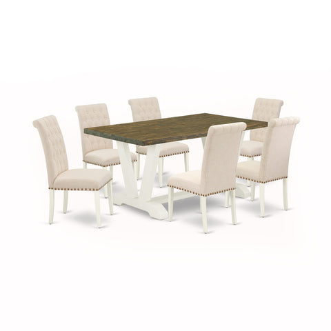 This modern dining table set includes 6 awesome Dining Chairs and a beautiful dining table. This modern dining table is offered in an elegant Linen White finish. In addition, the Kitchen chairs in a Light Beige linen fabric enhance the elegance of any kitchen or dining area. Our dinette set delivers great durability because this dining table is built from high quality Asian Wood which can bear the weight of 300 Lbs. We have created these Modern dining chairs and a rectangular dining table with the help of highly experienced carpenters, who generate a smooth and high-end finish to this kitchen set. We try to offer innovative as well as easy to assemble products. Our high-quality dining table set is perfect for you and your beautiful dining area as well as the kitchen area. You can use it for casual home parties or intimate gatherings. Keep enjoying East West modern furniture!