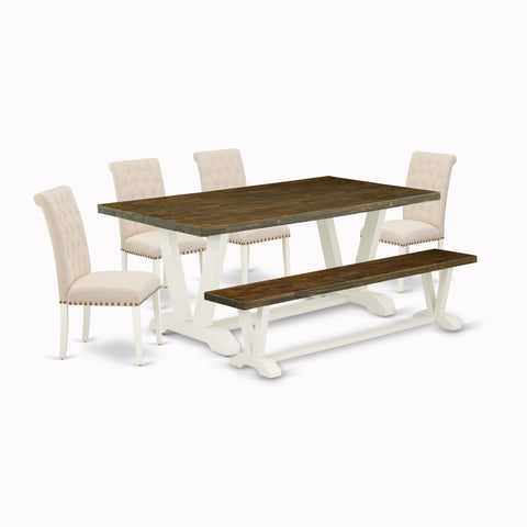 V077BXRVT-O 6-Piece Dining Set with V-Legs, Parson Chairs, and Bench in Multi-Color, 40x72