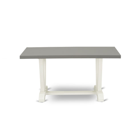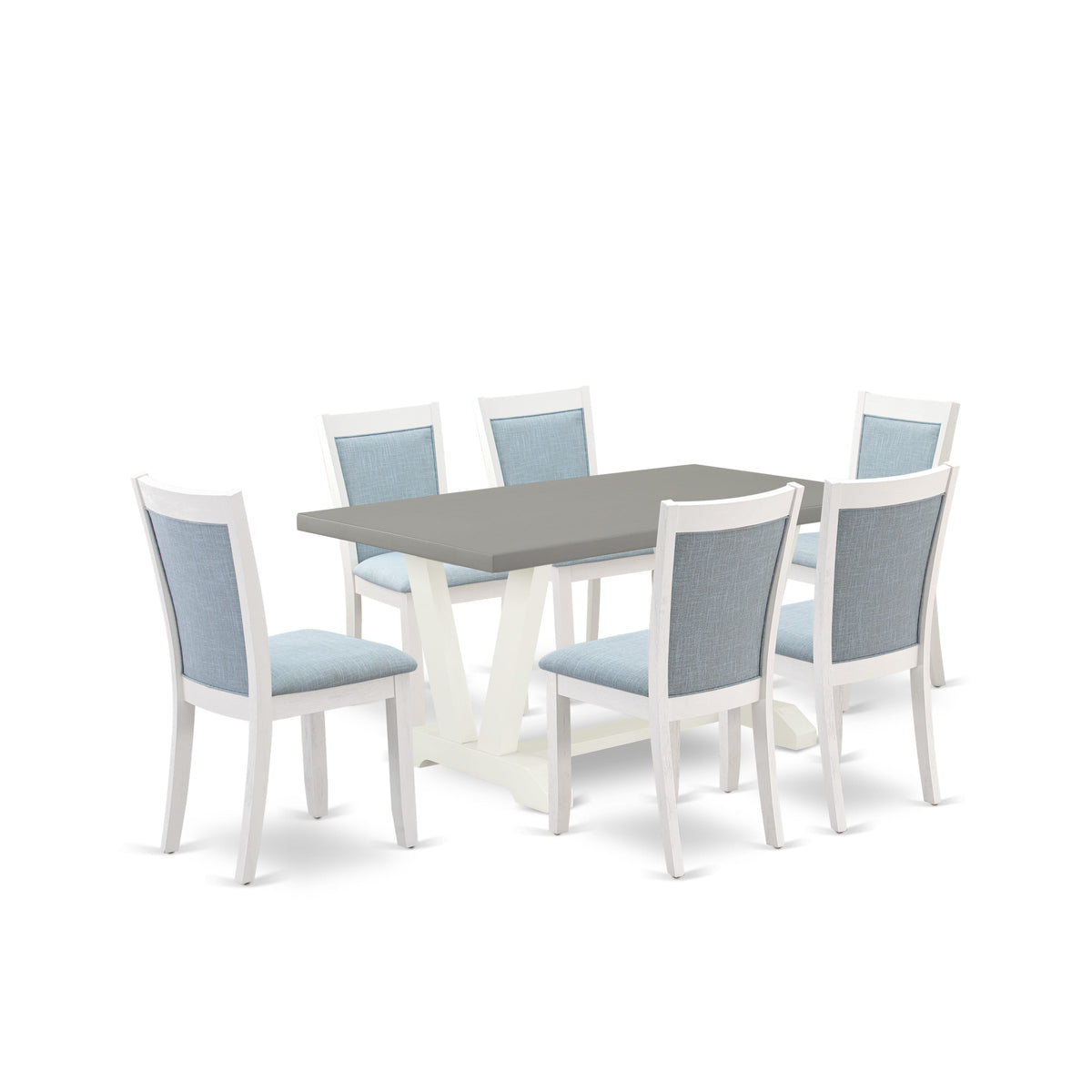 Our eye-catching dining room set will enhance the appearance of any dining area with its stylish design and decor. This 7-Piece dining table set consists of a beautiful dining table and 6 matching dining chairs. This dining table set adds some simple and contemporary elegance to your home. Ideal for dinette, kitchen, and dining areas, this dining table set seats up to 6 people with a dining table perfect for family-style dinners, and meals with friends. This dinner table set will increase the elegance of any dining area with its ageless design. This wood dining table has a Cement Table Top and Wire Brushed Linen White finish V-Style Legs. These upholstered chairs have Baby Blue Linen Fabric Seat and Linen White Solid Wood Chair Legs. The kitchen chair feature a Linen Fabric seat and Stylish Back, while the back of the upholstered dining chair is outlined in a wooden frame and the center of the back is padded. We have made this dining room set with the help of highly experienced carpenters, who generate a smooth and high-quality finish to this kitchen table set. Our dining table set is quite simple to clean and always gives a modern appeal. Keep Enjoy with East West Furniture!
