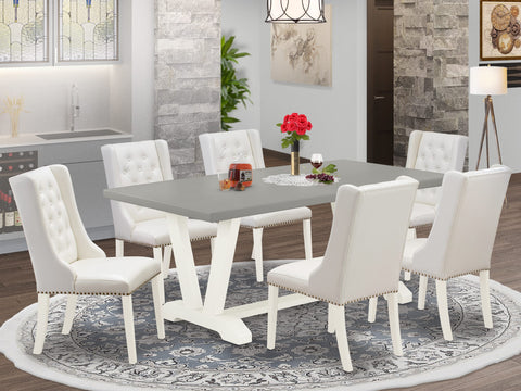 This sophisticated 7-Pc dining room set is going to make your family mealtime more comfortable and pleasant! Our 7 Pc dinette set includes 6 padded chairs and 1 modern dining room table. These Button tufted-back chairs are slightly and elegantly curved, expertly finished with PU Leather soft upholstery. Our mid century dining chairs seat is created from PU Leather that offers a wonderful sitting experience. This rectangular table has a rectangular Cement tabletop and Wire Brushed Linen White V-Style Legs. These nailhead parson chairs have White PU Leather and Linen White solid wood chair legs. These upholstered dining chairs stand on a sturdy hardwood frame with solid legs and a contemporary Linen White finish. Designed with easy and fast assembly in mind, each set comes conveniently flat packed with easy to follow instructions and all necessary tools included. This contemporary, budget-friendly, durable and comfortable dining room set furniture can be a great choice for you and your family if you enjoy the dining experience. Enjoy with East West Furniture!