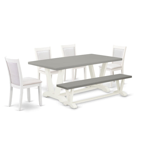 Our eye-catching dining set will enhance the beauty of any dining area with its stylish style and decor. This 6-Piece kitchen table set contains a dinner table, 4 matching dining room chairs and a Dining Bench. This dining room set adds some simple and contemporary elegance to your home. Ideal for dinette, kitchen and dining areas, this table set seats up to 6 people with a wood dining table great for family style dinners, meals with friends. This dining table set will increase the elegance of any dining area with its ageless style. This kitchen table has a Cement Table Top and Wire Brushed Linen White finish V-Style Legs. These upholstered chairs have Cream Linen Fabric Seat and Linen White Solid Wood Chair Legs. The parson chairs feature a Linen Fabric Seat and Stylish Back, while the back of the dining chairs is outlined in a solid wood frame and the center of the back is padded. We have made this dinner table set with the help of highly experienced carpenters, who generate a smooth and good quality finish to this dining set. Our dining table set is quite easy to clean and always offers an attractive appeal. Keep Enjoy with East West Furniture!