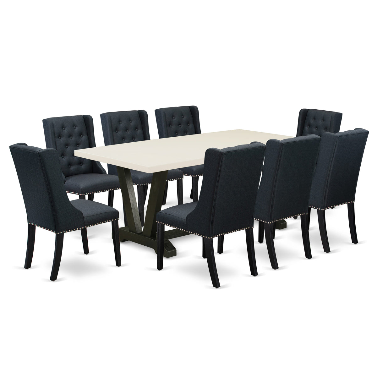This sophisticated 9-Piece kitchen table set is going to make your family mealtime more comfortable and pleasant! Our 9 Piece dining table set includes 8 dining room chairs and a modern dining room table. These Button Tufted-Back chairs are slightly and elegantly curved, expertly finished with Linen Fabric soft upholstery. Our dining chair seat is created from Linen Fabric that gives a marvelous sitting experience. This dining room table has a rectangular Linen White tabletop and Wire brushed Black V-Style Legs. These nailhead dining room chairs have Black Linen Fabric and Wire Brushed Black wooden chair legs. These parson chairs stand on a sturdy hardwood frame with solid legs and a contemporary Wire Brushed Black finish. Designed with easy and fast assembly in mind, each set comes conveniently flat packed with easy to follow instructions and all necessary tools included. This contemporary, budget-friendly, durable and comfortable dining room set furniture can be a great choice for you and your family if you enjoy the dining experience. Enjoy with East West Furniture!