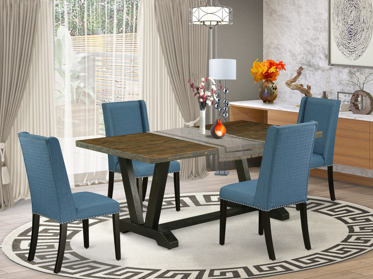 V677FFF8U-M 5 Piece Dining Set with Rectangular Table, V-Leg Design & Comfortable Blue Parson Chairs, 40x72