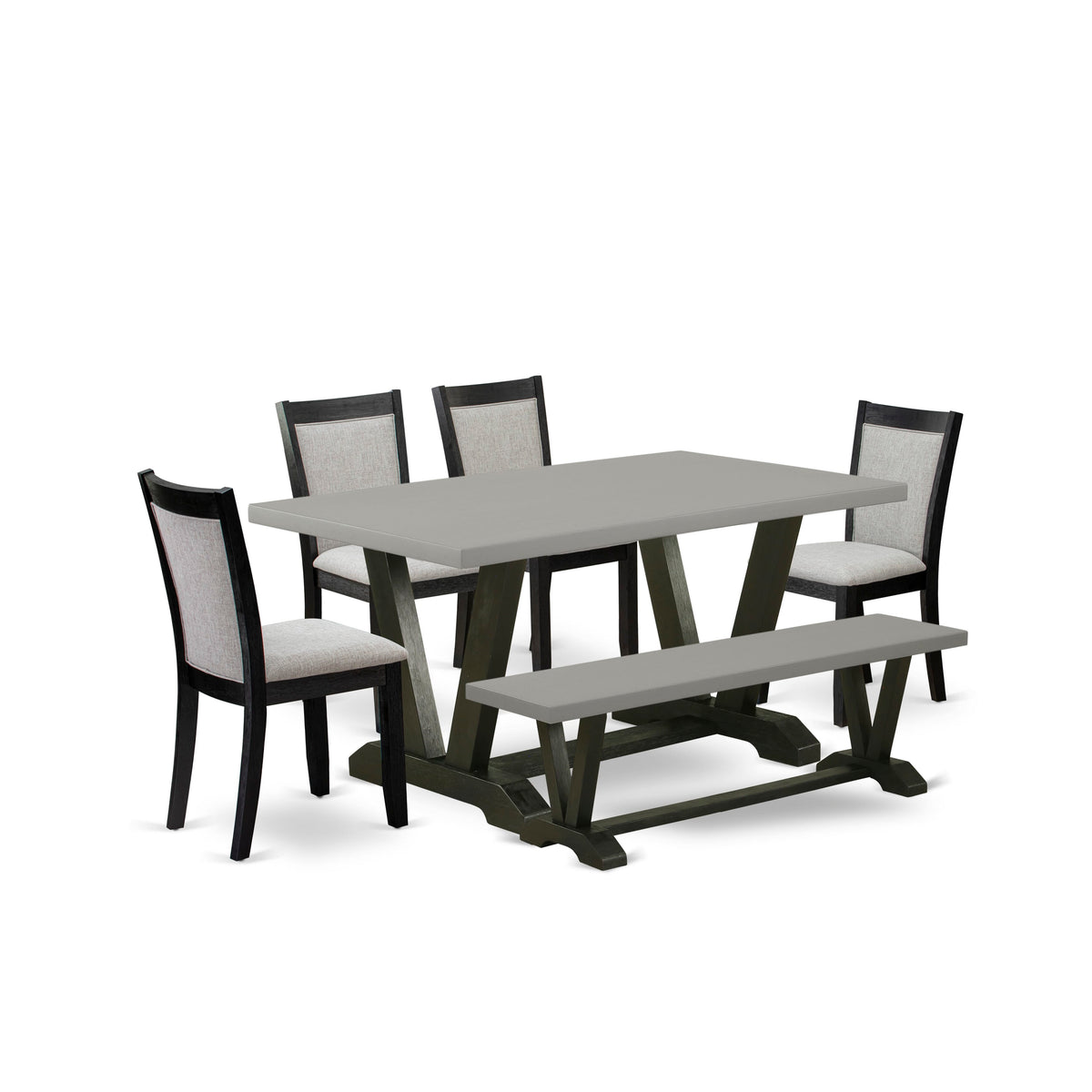 This 6 Piece dinette set includes a dinner table, a bench for dining room table, and 4 matching upholstered dining chairs to make your family mealtime more comfortable as well as pleasant. The frame of this kitchen dining table set is created of prime quality Asian wood, which offers fantastic durability and stability. The dining chairs are slightly and stylishly curved, expertly finished with the help of highly experienced carpenters. These kitchen chairs seat offers linen fabric that is soft and has strong spring elasticity, offering the best comfortable contact experience. The seat of the upholstered dining chairs is wide enough to make your seating comfort. Linen Fabric wooden dining chairs add stylish intrigue to your dining room. This mid-century dining set stands on a sturdy hardwood frame with solid legs and a contemporary Wire Brushed Black finish. The rectangular modern dining table and dining table bench have a Cement top with V-Style Legs. The matching color of the wood dining chairs with the rectangular kitchen table and dining table bench brings a great contrast in any dining area. This beautiful dining room table set is easy to clean with a damp cloth and will always offer fresh appeal. The worth mentioning is that the installation process of our luxurious dining room set is very simple and easy to operate. Each set comes conveniently flat packed with easy to follow guidelines and all required equipment included. You only need to follow the steps in the manual to complete the assembly very quickly. You'll love our kitchen dining table set top quality, design, and affordability!