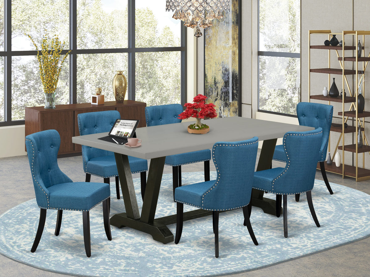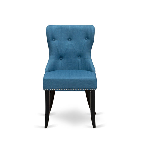 This 7-pc kitchen table set includes 6 upholstered dining chairs and 1 modern rectangular dining table. These mid century dining chairs have a Linen Fabric seat, Button Tufted Chair Back, and the modern rectangular dining table includes a rectangular top and Wooden Legs. The kitchen chair seat and the chair back are constructed from Linen Fabric in a Blue color kitchen chairs hardwood frame, and the Linen Fabric seat is very easy to clean. You can clean dust quite simply and often save time by using a damp cloth. These padded parson chairs and the wood dining table are the ideal choices for your dining room or kitchen. The easy structure of the dining padded chairs and the kitchen table, as well as screws of the same size that allow quick and easy, put together.