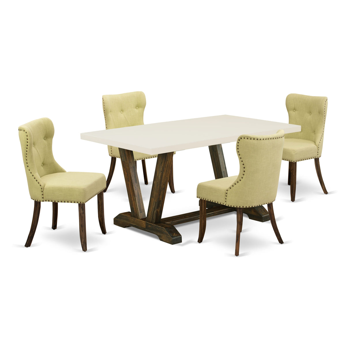 This 5-piece dining room table set consists of 4 dining chairs and 1 modern dining room table. These dining chairs have a Linen Fabric seat, Button Tufted Chair Back, and the dining table includes a rectangular top and Wooden Legs. The upholstered dining chairs seat and the chair back are constructed from Linen Fabric in a Limelight color dining chair solid wood frame and the Linen Fabric seat is quite easy to clean. You can clean dirt quite simply and frequently to save time by using a damp cloth. These kitchen chairs and the breakfast table is the ideal choice for your dining room or kitchen. The easy structure of the kitchen chairs and the modern rectangular dining table, as well as screws of the same size that allow simple and fast, put together.