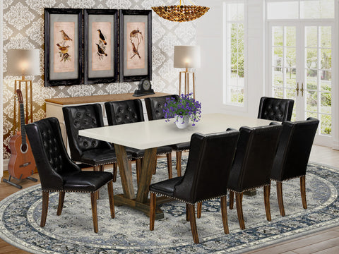 This sophisticated 9-Piece dining room set is going to make your family mealtime more comfortable and pleasant! Our 9 Piece modern dining table set includes 8 padded chairs, and 1 dining table. These Button Tufted-Back chairs are slightly and elegantly curved, expertly finished with Pu Leather soft upholstery. Our mid-century dining chairs seat is created from Pu Leather that gives a fantastic sitting experience. Our dining table has a rectangular Linen White tabletop and Distressed Jacobean V-Style Legs. These nail head parsons chairs have Black Pu Leather and solid wood chair legs. These dining chairs stand on a sturdy hardwood frame with solid legs and a contemporary Distressed Jacobean finish. Designed with easy and fast assembly in mind, each set comes conveniently flat packed with easy to follow instructions and all necessary tools included. This contemporary, budget-friendly, durable, and comfortable dining room set furniture can be a great choice for you and your family if you enjoy the dining experience. Enjoy with East West Furniture!