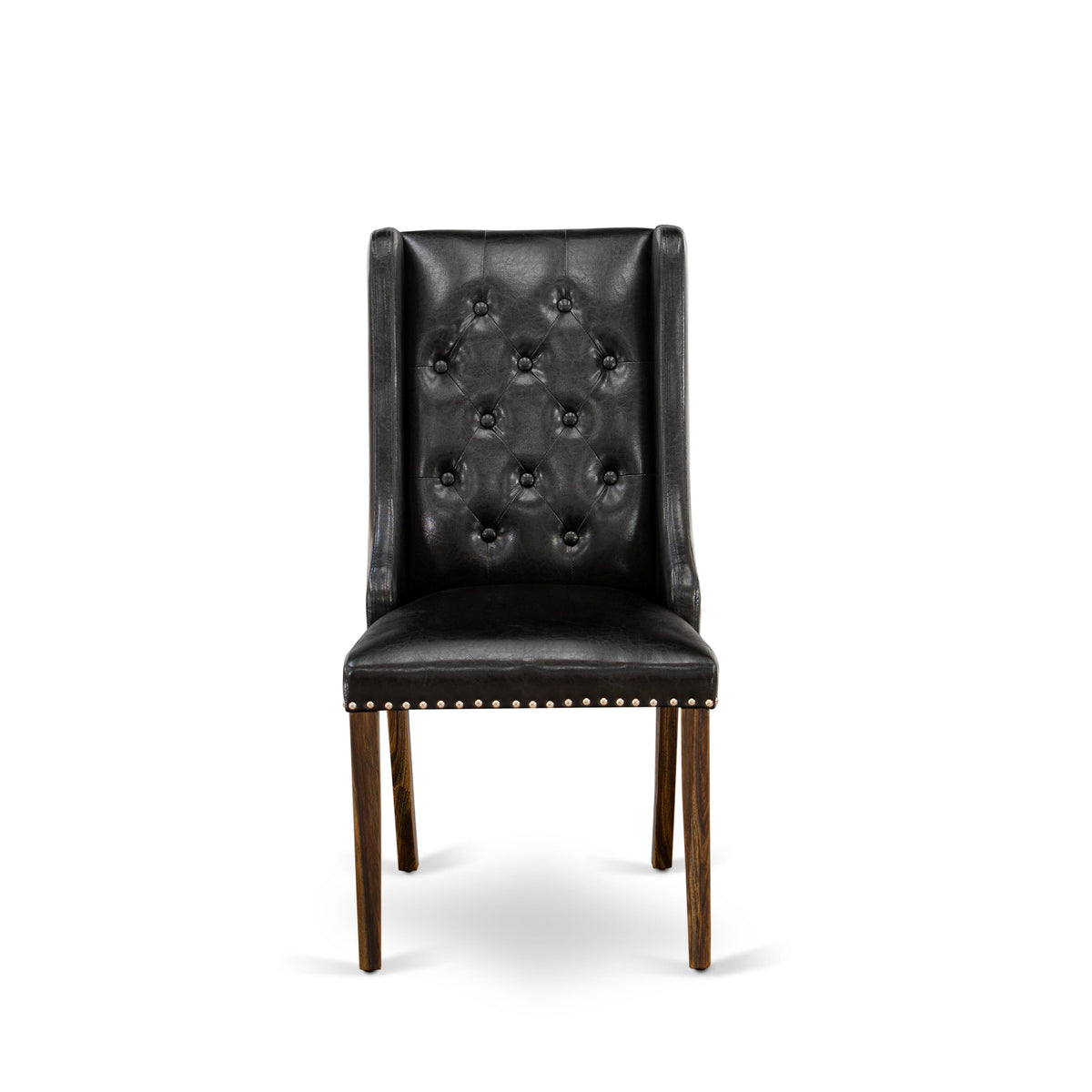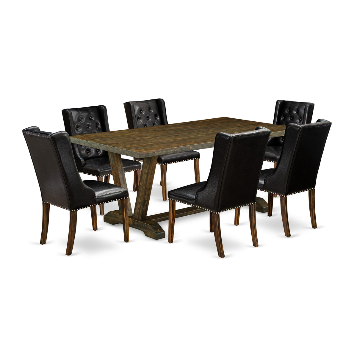 This sophisticated 7-Piece dining table set is going to make your family mealtime more comfortable and pleasant! Our 7 Piece modern dining table set includes 6 dining chairs and 1 modern dining table. These Button Tufted-Back chairs are slightly and elegantly curved, expertly finished with Pu Leather soft upholstery. Our kitchen chair seat is created from Pu Leather which gives a marvelous sitting experience. This modern dining room table has a rectangular Distressed Jacobean tabletop and Distressed Jacobean V-Style Legs. These nailhead dining chairs have Black Pu Leather and Distressed Jacobean solid wood chair legs. These dining chairs stand on a sturdy solid wood frame with solid legs and a contemporary Distressed Jacobean finish. Designed with easy and fast assembly in mind, each set comes conveniently flat packed with easy to follow instructions and all necessary tools included. This contemporary, budget-friendly, durable, and comfortable dining room set furniture can be a great choice for you and your family if you enjoy the dining experience. Enjoy with East West Furniture!