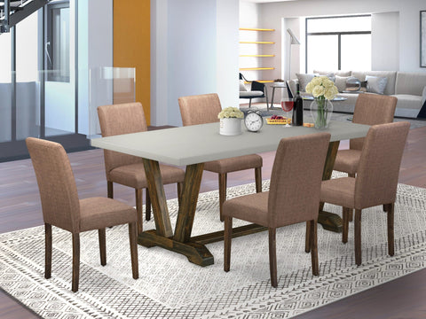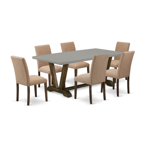 This dinette set includes 6 dining chairs and a kitchen dining table. This modern rectangular dining table has a rectangular top and beautiful legs. The dining chairs have a linen fabric seat and a stylish high back. The seat of our dining room chairs offers a good sitting experience and a stylish high back to fit your Back Correctly for the backrest. Modern chairs in this dining room consist of legs. The color of the modern chair seat is Light Sable and the wooden legs are Distressed Jacobean. The top color of the dining room table is Cement and the wooden legs are Distressed Jacobean. The kitchen dining table set is made of solid wood. This wood is also called rubber wood. This wood always provides durability and strength. This rectangular table and dining chairs give more balance with the help of legs because this is made of rubber wood. Make your completely dining room set stronger. You can use this dining room set for a long time. You can move our modern chairs under the dinner table when you finish your meal. Easy to assemble these mid century dining chairs and dining table. You only need to take about 50-60 minutes to build each dining set. This dining room set comes with all the necessary tools. This dining set cleans quickly because this dinette set design has smooth. You can simply clean this set with any brush and dust cleaner cloth. You can clean this kitchen table set within a few minutes. This dining table set matches any room décor because of its style. This dinette set gives always-fresh look and attracts any person who comes to your home.