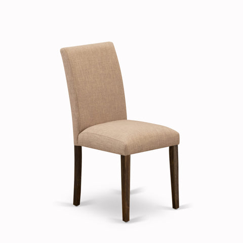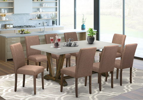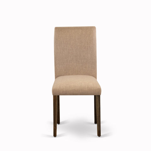 This dinette set includes 8 dining chairs and a dining room table. This modern dining table has a rectangular top and beautiful legs. The modern dining chairs have a linen fabric seat and a stylish high back. The seat of our Dining chairs provides a good sitting experience and a stylish high back to fit your Back Correctly for the backrest. Dining chairs in this dining area consist of legs. The color of the Dining room chair seat is Light Sable and the wooden legs are Distressed Jacobean. The top color of the kitchen dining table is Cement and the wooden legs are Distressed Jacobean. The Kitchen Dining Room Chairs are created from solid wood. This wood is also called rubber wood. This wood always provides durability and strength. This kitchen table and kitchen chairs give more balance with the help of legs because this is made of rubber wood. Make your complete kitchen dining table set stronger. You can use this kitchen dining table set for a long time. You can move our mid-century dining chairs under the dining table when you finish your meal. Easy to assemble these mid century modern dining chairs and a rectangular table. You only need to take about 50-60 minutes to build each dinette set. This Kitchen Dining Room chair comes with all the necessary tools. This dining table set cleans easily because this dinette set design has smooth. You can simply clean this set with any brush and dust cleaner cloth. You can clean this wooden dining table set within a few minutes. This kitchen table set matches any room décor because of its style. This wooden dining table set gives always-fresh look and attracts any person who comes to your home.