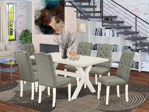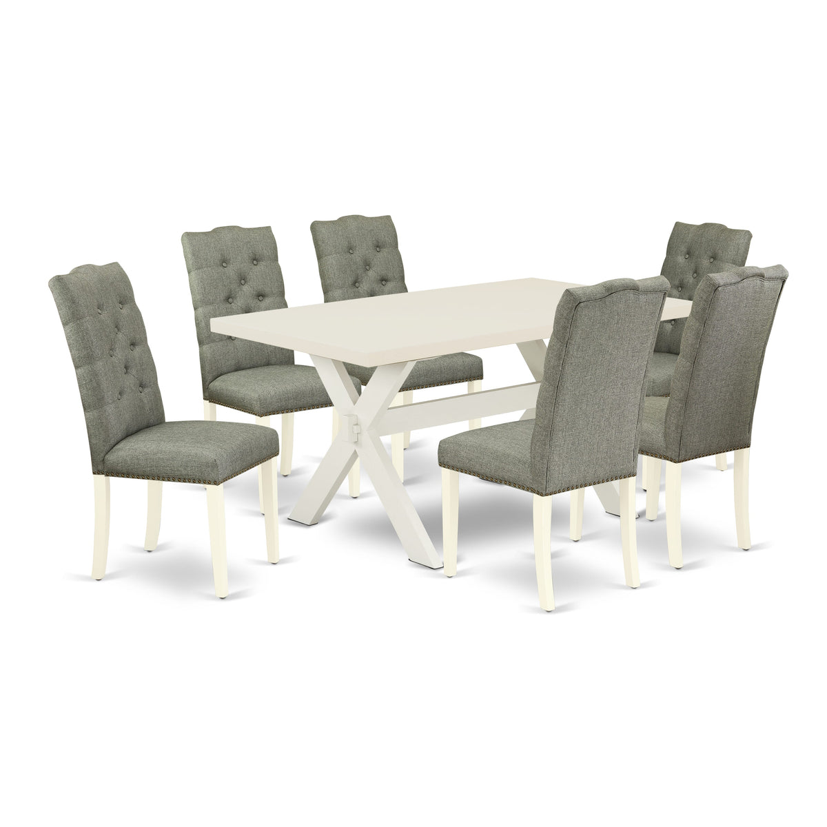 Bring your kitchen or dining area to the next level with our innovative design dining room set. Consists of 6 buttons tufted back dining room chairs with slightly curved angles throughout, in a bright colored finish. The mid century dining table features a classic style with a painted, fresh Wire Brushed Off-White finish legs for a simple, yet a classy table. Enjoy meals with your family, with this elegant dining room table set. The chair is covered with breathable linen fabric to provide a comfy touch. High back kitchen chairs with copper nails around look noble and stylish. This listing has a premium color of Off-White finish for mid century dining table top and Smoke Color Finish Parson Chair of Stylish back. Our lovely premium colors increase the magnificence of your dining area and offer a fantastic look to your dining room or kitchen area. East West furniture always made of modern furniture along with easy assembling parts. We try to keep our furniture parts modern as well as simple. Our high class rectangular dining table set is perfect for your fantastic dining room as well as the kitchen area. Our dining set is the perfect complement to your home! Provide your guests with the best seat in the house. Enjoy with East west Furniture!