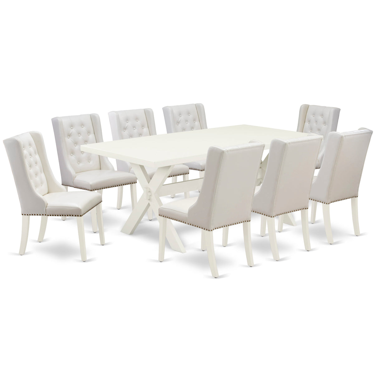This elegant 9-Piece dining room set is going to make your family mealtime more comfortable and pleasant! Our 9 Piece kitchen table set consists of 8 mid century dining chairs and 1 dining room table. These Button tufted-back chairs are slightly and elegantly curved, expertly finished with Pu Leather soft upholstery. Our parson dining room chairs seat is created from Pu Leather that offers a wonderful sitting experience. This wood dining table has a rectangular Linen White table top and Wire Brushed Linen White X-Style Legs. These nail head parson dining room chairs have White Pu Leather and Linen White solid wood chair legs. These upholstered dining chairs stand on a sturdy hardwood frame with solid legs and a contemporary Linen White finish. Designed with easy and fast assembly in mind, each set comes conveniently flat packed with easy to follow instructions and all necessary tools included. This contemporary, budget-friendly, durable and comfortable dining room set furniture can be a great choice for you and your family if you enjoy the dining experience. Enjoy with East West Furniture!