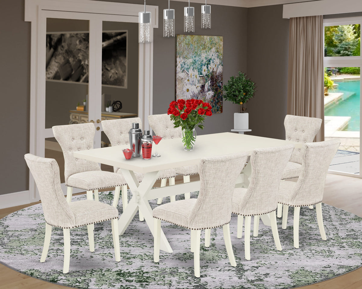 This 9-piece modern dining table set consists of 8 parson chairs and 1 modern rectangular dining table. These parson dining chairs have a Linen Fabric seat, Button Tufted Chair Back, and the dining room table consists of a rectangular top and Wooden Cross Legs. The parson chairs seat and the chair back are produced from Linen Fabric in a Doeskin color parson dining chairs solid wood frame and the Linen Fabric seat is quite simple to clean. You can clean dust easily and frequently to save time by using a damp cloth. These dining room chairs and the dining table are a great choice for your dining room or kitchen. The quick frame of the dining chair and the wood dining table as well as screws of the same size allow a simple and fast setup.