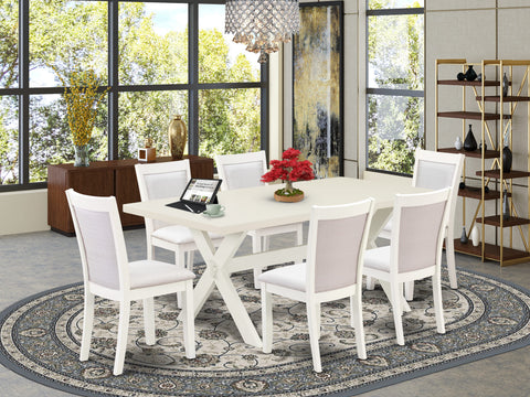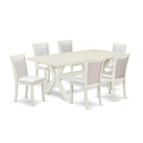 Our eye-catching kitchen table set will boost the appearance of any dining area with its stylish style and decor. This 7-Piece dining table set includes an attractive kitchen table and 6 matching parson dining chairs. This dining table set adds some simple and contemporary elegance to your home. Ideal for dinette, kitchen, and dining areas, this dinette set seats up to 6 people with a modern kitchen table perfect for family-style dinners, and meals with friends. This dining table set will increase the beauty of any dining area with its ageless design. This wood dining table has a Linen White Table Top and Wire Brushed Linen White finish X-Style Legs. These mid century modern dining chairs have Cream Linen Fabric seats and Linen White Solid Wood Chair Legs. The dining chairs feature a Linen Fabric seat and Stylish Back, while the back of the upholstered chairs is outlined in a solid wood frame and the center of the back is padded. We have made this kitchen dining table set with the help of highly experienced carpenters, who generate a smooth and high quality finish to this dining table set. Our table set is quite easy to clean and always offers a beautiful appeal. Keep Enjoy with East West Furniture!