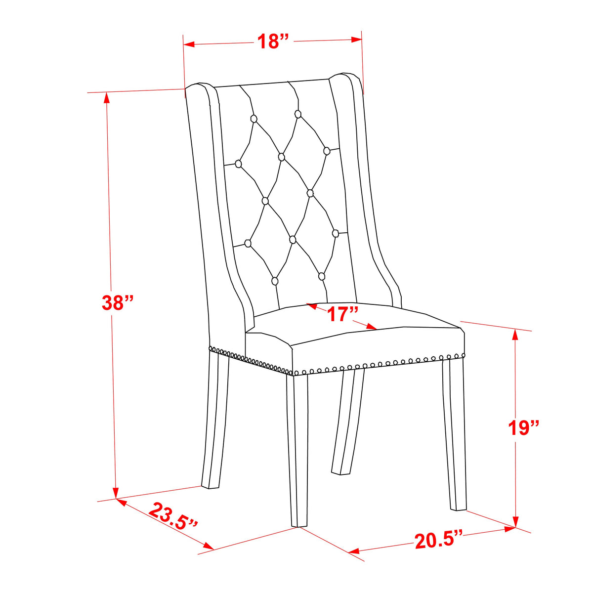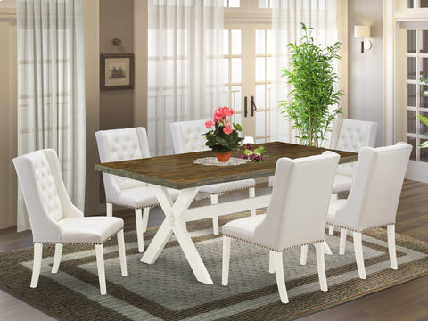 This elegant 7-Pc modern dining table set is going to make your family mealtime more comfortable and pleasant! Our 7 Pc dinette set contains 6 upholstered dining chairs and 1 modern dining table. These Button tufted-back chairs are slightly and elegantly curved, expertly finished with Pu Leather soft upholstery. Our dining chairs seat is made from Pu Leather which offers a wonderful sitting experience. This dining room table has a rectangular Distressed Jacobean table top and Wire Brushed Linen White X-Style Legs. These nail head dining room chairs have White Pu Leather and linen white solid wood chair legs. These parson dining chairs stand on a sturdy hardwood frame with solid legs and a contemporary Linen White finish. Designed with easy and fast assembly in mind, each set comes conveniently flat packed with easy to follow instructions and all necessary tools included. This contemporary, budget-friendly, durable and comfortable dining room set furniture can be a great choice for you and your family if you enjoy the dining experience. Enjoy with East West Furniture!
