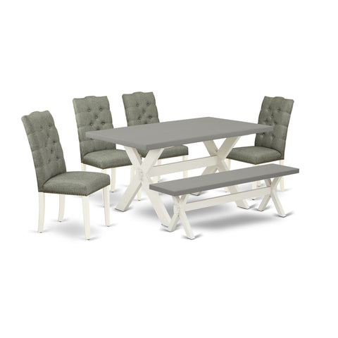 The 6-pc kitchen dining set consists of 4 kitchen parson chairs, 1 modern rectangular dining table and a kitchen table bench. These dining chairs have a Linen Fabric seat, Button Tufted Chair Back, and the modern kitchen table is consists of a rectangular top and Wooden Cross Legs. The dining padded chairs seat and the chair back is made of Linen Fabric in a Smoke color upholstered dining chair solid wood structure and the Linen Fabric seat is quite easy to clean. You can clean dust quite simply and often save time by using a damp cloth. These parson chairs and the modern rectangular dining table is the ideal choice for your dining room or kitchen. The quick structure of the parson dining room chairs and the kitchen dining table as well as screws of the same size that allow fast and simple set up.