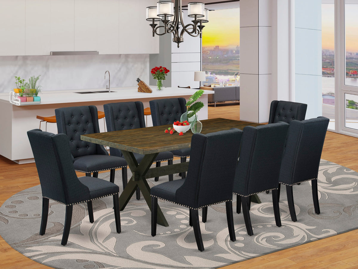 X677F7PKH-V 9-Piece Dining Room Ensemble with Rectangular Table and X-Leg Design Plus 8 Luxe Black Upholstered Seats