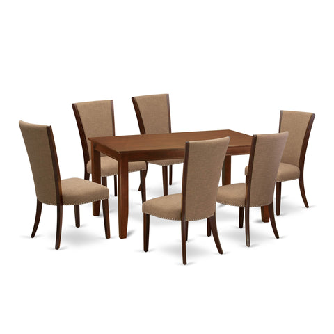 East West Furniture DUVE7-ND5-70 of six pieces of indoor dining chairs with Linen Fabric Light Sable color and an eye-catching rectangle dining room table with Mahogany color.