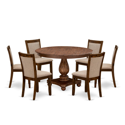 Round Dining Set - 7 Piece with Pedestal Table & 6 Upholstered Tan Chairs F2MZ7-0M0 in Antique Finish