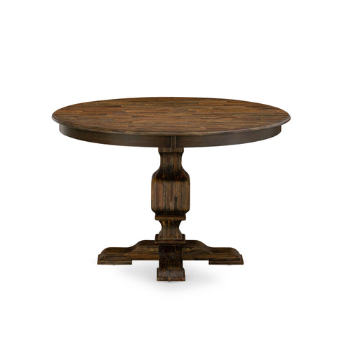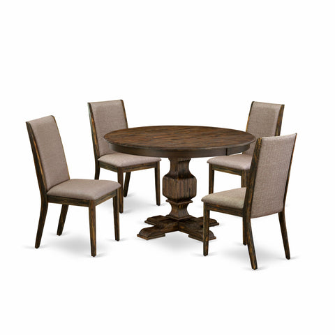 This mid century dining set offers 4 dining chairs and a wooden table to boost the beauty of any kitchen area or dining area. This mid century modern dining table is provided in an attractive Distressed Jacobean finish. In addition, the modern dining chairs in a Dark Khaki Linen Fabric enhance the beauty of any home. Ideal for dinette, kitchen, and dining areas, this multi-functional dining room table set seats up to 4 people, perfect for families to enjoy mealtimes together. This dinner table has a Distressed Jacobean Round table top and Distressed Jacobean Pedestal Legs. Our Nailhead dining chairs have Dark Khaki Linen Fabric and Distressed Jacobean Wooden 4 Legs. We designed this modern kitchen dining table set using only premium quality and sturdy materials. Designed with simple and fast assembly in mind, each set comes conveniently flat packed with easy-to-follow instructions and all necessary tools included. This contemporary, budget-friendly, durable and comfortable mid century modern dining set can be a great choice for you and your family if you enjoy the dining experience. Our dining room set is quite easy to clean and always provides a great appeal. Enjoy with East West Furniture!