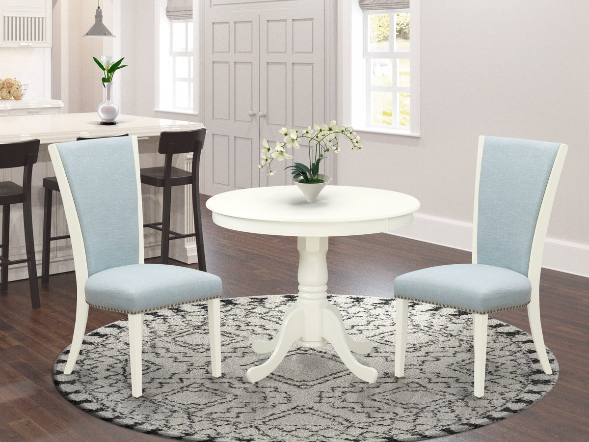ANVE3-IOU-2O 3-Piece Dining Ensemble Featuring a Circular Table & Soft Blue Linen Chairs, 36 Linen White