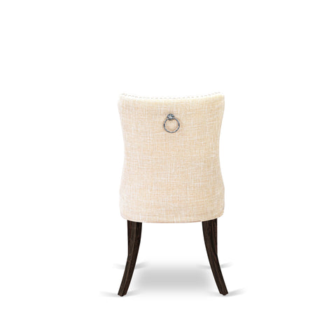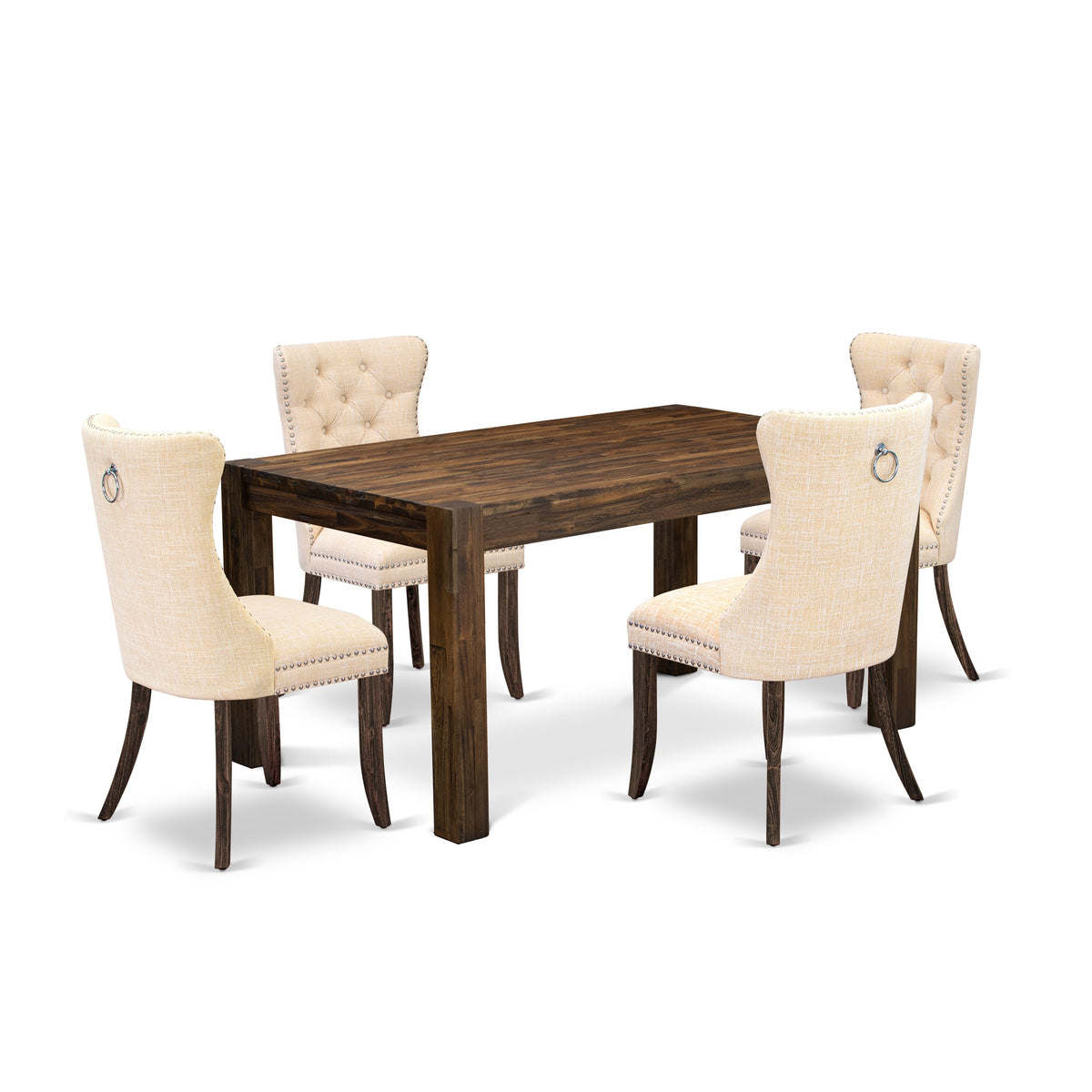 This stylish 5-piece dining table set effortlessly blends together fashion, strength, and practicality to elevate The atmosphere of your dining area. The kitchen table set consists of a rectangular kitchen table with sturdy legs and 4 upholstered dining chairs, making it an excellent choice for family gatherings, hosting guests, or casual dining occasions. It adds an element of sophistication to your home decor. The dining table set showcases a distressed Jacobean-style rectangular table matched with comfortable Light Beige kitchen chairs featuring rustic-style distressed Jacobean legs. This combination creates a charming rustic ambiance in your dining space, establishing a warm and modern setting for both family and guests. Crafted with precision from high-quality Asian wood, This kitchen table set ensures long-lasting durability and resistance to everyday wear and tear. The dining chairs have padded seats upholstered in Linen Fabric, ensuring exceptional comfort during extended dining sessions. Whether you're hosting a dinner party or enjoying a quiet family meal, These kitchen chairs offer comfortable seating for extended periods. Assembling This kitchen table set is a straightforward process, designed for easy assembly and including all The necessary hardware and instructions.