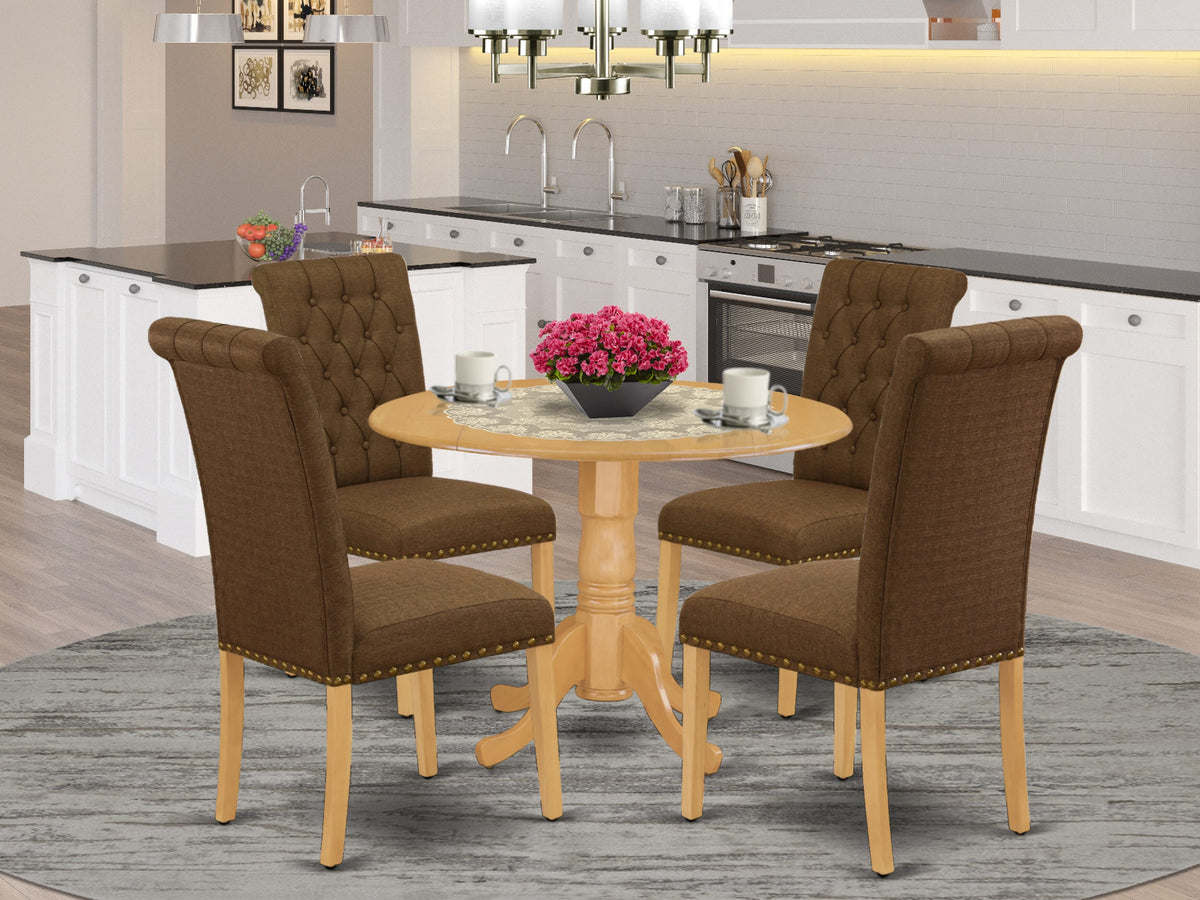 DLBR5-7LH-3I 5-Piece Set with Round Drop Leaf Table & 4 Linen-Seated Chairs, 42x42 in, Oak Finish