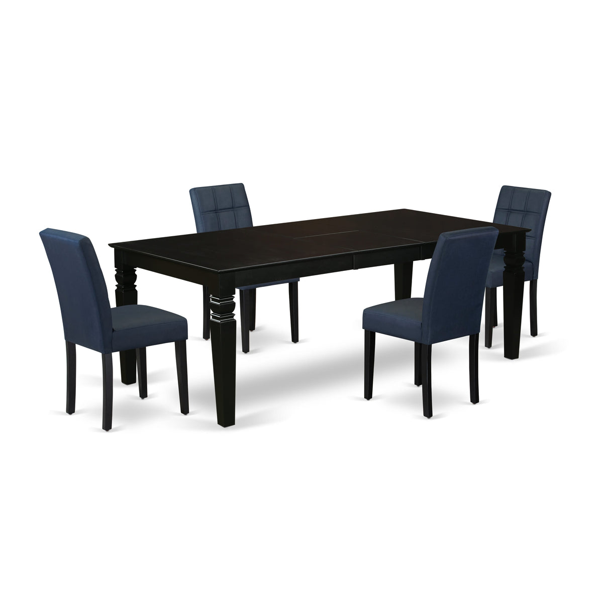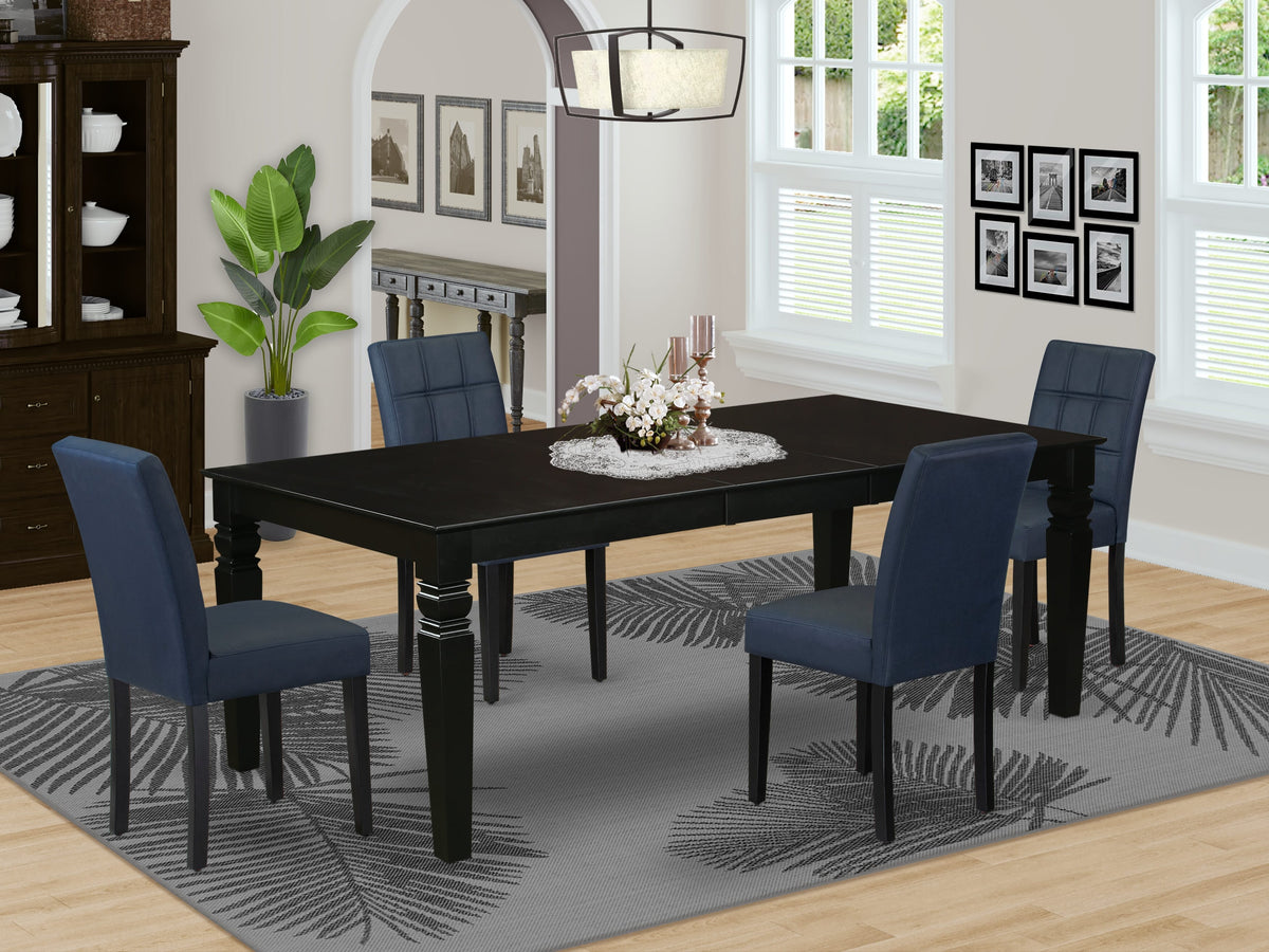 The 5-piece contemporary kitchen table set effortlessly combines style, functionality, and comfort, enhancing The ambiance of your dining area. This dining table set consists of a rectangular table with a Butterfly Leaf tabletop, supported by 4 sturdy legs, and 4 upholstered dining chairs, all thoughtfully designed to elevate your dining experience. Striking a perfect balance between classic and modern design, the wooden table features an elegant black rectangular tabletop complemented by matching black wooden legs. The dining room chairs are embellished with Dark Navy Blue faux Leather upholstery and coordinating black wooden legs. Crafted from high-quality rubberwood, this dining table set ensures long-lasting durability for daily use. Rubberwood's inherent strength and resistance to wear and tear make it an excellent choice for everyday dining. The kitchen chairs, equipped with easy-to-clean faux Leather seats and stylish chair backs, offer convenience, especially for families. Assembling and maintaining These pieces is straightforward, as you can easily assemble The kitchen chairs and dining table at home, and regular furniture cleaners will help Them maintain Their pristine appearance. This compact kitchen table set consistently exudes a fresh and inviting look, making it a remarkable addition to your dining area.