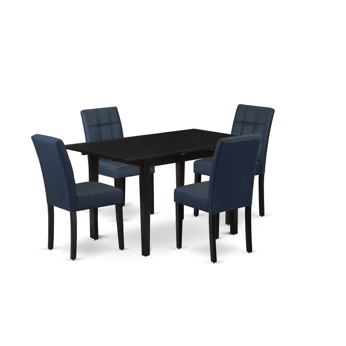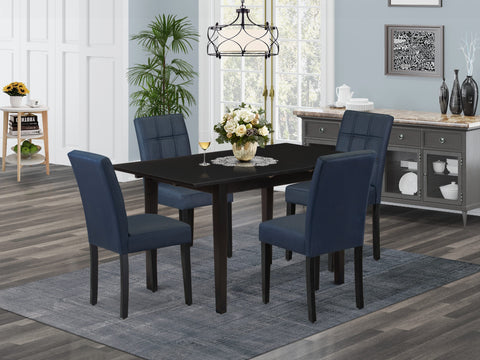 The 5-piece kitchen table set seamlessly combines style, functionality, and comfort, enhancing The overall atmosphere of your dining room. Includes a rectangular table with a practical Butterfly Leaf tabletop, supported by 4 sturdy legs. Additionally, it comes with 4 carefully crafted upholstered dining chairs that elevate your dining experience. Striking a perfect balance between classic and contemporary aesthetics, the kitchen table features an elegant black tabletop perfectly matched with black wooden legs. The dining room chairs are adorned with luxurious Dark Navy Blue faux Leather upholstery and coordinating black wooden legs. Made from high-quality rubberwood, this dining table set ensures exceptional durability, making it an excellent choice for daily use. Rubberwood's natural strength and resistance to wear and tear make it a dependable option for everyday dining. The kitchen chairs feature easy-to-clean faux Leather seats and stylish chair backs, offering added convenience, especially for families. Assembling and maintaining These pieces is straightforward, making it easy to set up The dining chairs and kitchen table at home. Regular furniture cleaners will help preserve Their flawless appearance. This compact dining table set consistently creates a fresh and welcoming atmosphere, making it a noteworthy addition to your dining area.