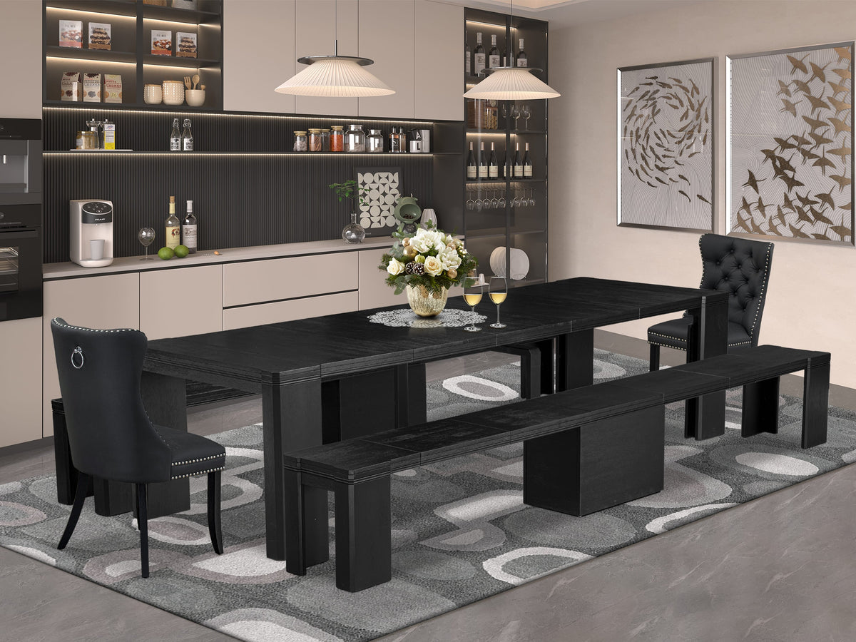 Step into the world of Luxe by East West Furniture, your go-to destination for exclusive premium furniture that oozes elegance and charm. Take a look at our 5-piece Extendable Dining Table Set, which includes a meticulously crafted dining table, 2 cozy wooden benches, and 2 inviting upholstered kitchen chairs. These chairs not only offer a comfy spot to sit but also blend style with a Wire Brushed Black tabletop and plush Dark Gray Faux Leather upholstery. Our furniture is all about quality, crafted from high-quality Acacia wood for durability and balance. The extendable dining table ensures a stable and long-lasting dining experience, while the modern kitchen chairs provide maximum comfort with their Faux Leather seats and stylish slatted backs. Plus, the butterfly leaf table adds practicality by allowing you to adjust the table size effortlessly. We've got your back with included accessories for easy installation, and when it's time to clean up, a simple wipe-down will do the trick. Luxe by East West Furniture is here to elevate your dining space with unmatched elegance, making your home a stylish and cozy place to gather with friends and family.