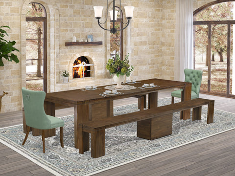 Step into the world of Luxe by East West Furniture, our exclusive luxury furniture brand, and immerse yourself in its unparalleled sophistication up close. Luxe by East West Furniture introduces a 5-piece extendable dining collection, comprising 2 dining chairs, 2 expandable dining benches, and a versatile dining table with expandable capabilities. This adaptable design allows you to effortlessly create additional dining space when needed. The extendable table boasts an Antique Walnut tabletop and legs, adding a touch of timeless elegance. The dining chairs, upholstered in Willow Green Faux Leather, not only offer comfort but also seamlessly coordinate with the matching Antique Walnut legs. The bench seats maintain the enduring Antique Walnut finish. This meticulously crafted extendable dining set is expertly constructed from robust Acacia hardwood. The use of resilient Acacia hardwood ensures not only the set's durability but also preserves its unique and attractive aesthetics over time. The contemporary dining set features stylish dining chairs with high-quality Faux Leather seats. These cushioned chairs showcase a thoughtfully designed backrest that provides exceptional support.