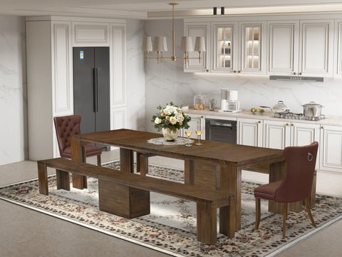 Step into the exquisite world of Luxe by East West Furniture, our exclusive luxury furniture brand, and immerse yourself in its unparalleled elegance up close. Luxe by East West Furniture unveils a 5-piece extendable dining collection, comprising 2 dining chairs, 2 expandable dining benches, and a versatile dining table with extendable capabilities. This adaptable design allows yoto expand your dining space whenever the need arises effortlessly. The extendable table boasts an Antique Walnut tabletop and legs, infusing it with a timeless sense of sophistication. The dining chairs, adorned with Burgundy Faux Leather upholstery, ensure not only comfort but also a seamless blend with the matching Antique Walnut legs. The bench seats maintain the enduring Antique Walnut finish. This meticulously crafted extendable dining set is expertly constructed from robust Acacia hardwood. The use of resilient Acacia hardwood guarantees the set's durability while preserving its unique and attractive aesthetics over time. The contemporary dining set features chic dining chairs with high-quality Faux Leather seats. These cushioned chairs showcase a thoughtfully designed backrest that offers exceptional support.