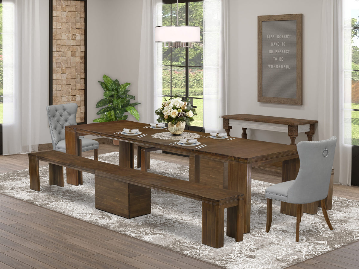 Enter the world of Luxe by East West Furniture, our exclusive luxury furniture brand, and experience its unmatched elegance up close. Luxe by East West Furniture introduces a 5-piece extendable dining collection, including 2 dining chairs, 2 expandable dining benches, and a versatile dining table with extendable capabilities. This adaptable design allows you to effortlessly enlarge your dining space whenever the need arises. The extendable table features an Antique Walnut tabletop and legs, infusing it with a timeless sense of sophistication. The dining chairs, embellished with Light Gray Faux Leather upholstery, ensure not only comfort but also seamless coordination with the matching Antique Walnut legs. The bench seats maintain the enduring Antique Walnut finish. This meticulously crafted extendable dining set is skillfully constructed from robust Acacia hardwood. The use of resilient Acacia hardwood guarantees the set's durability while preserving its unique and appealing aesthetics over time. The contemporary dining set encompasses chic dining chairs with high-quality Faux Leather seats. These cushioned chairs exhibit a thoughtfully designed backrest that provides exceptional support.