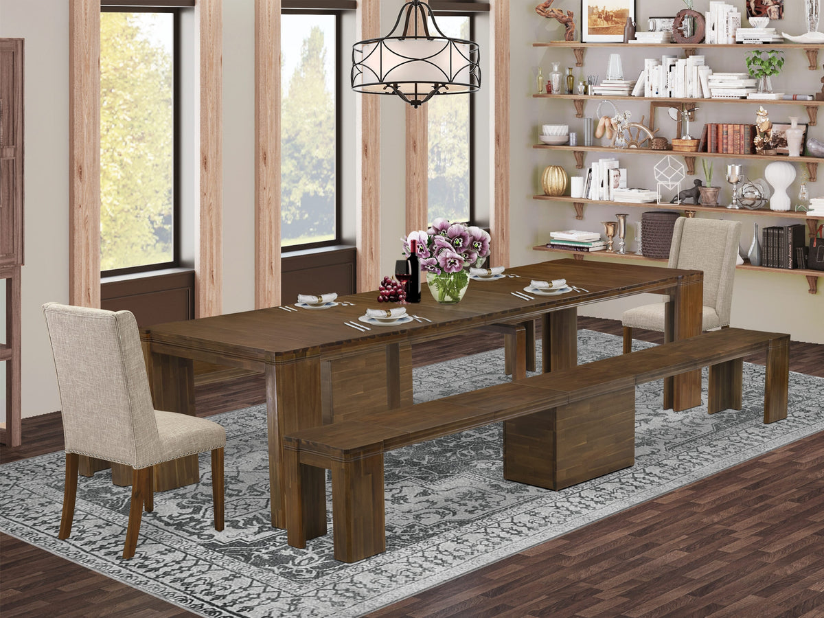 Step into the world of Luxe by East West Furniture, our exclusive luxury furniture brand, and experience its unparalleled elegance up close. Luxe by East West Furniture proudly presents a 5-piece extendable dining collection, comprising 2 dining chairs, 2 expandable dining benches, and a versatile dining table that can easily accommodate more guests when needed. This adaptable design allows you to effortlessly expand your dining space as required. The extendable table boasts an Antique Walnut tabletop and legs, infusing it with a timeless sense of sophistication. The dining chairs are adorned with Light Tan Linen Fabric upholstery, ensuring not only comfort but also seamless coordination with the matching Antique Walnut legs. The bench seats maintain the enduring Antique Walnut finish. This meticulously crafted extendable dining set is skillfully constructed from sturdy Acacia hardwood. The use of resilient Acacia hardwood ensures the set's durability while preserving its unique and appealing aesthetics over time. The contemporary dining set features stylish dining chairs with high-quality Linen Fabric seats, providing both elegance and comfort. These cushioned chairs showcase a thoughtfully designed backrest that offers exceptional support.