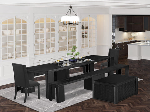 Included packages: A rectangular table, a coffee table, 2 Dining chairs and 2 wooden benches