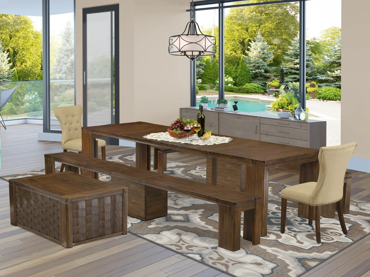 X02GA-GXU-MG Gourmet Elegance 6-Piece Extended Dining Ensemble Rectangular Table with Coffee Companion, Chairs, and Sleek Benches, in Vintage Walnut