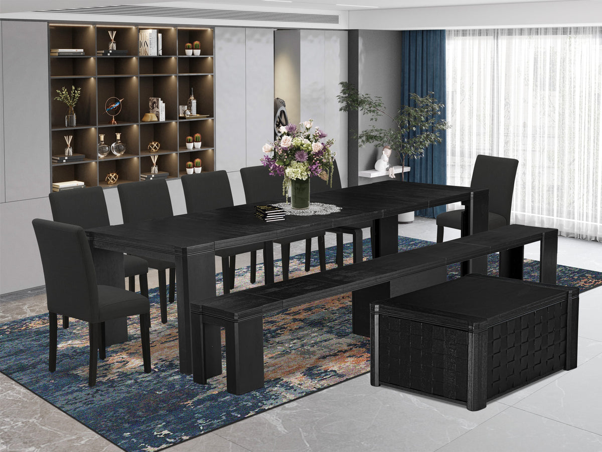 Witness the zenith of refinement with Luxe, an exclusive furniture collection meticulously crafted by East West Furniture. Luxe presents a thoughtfully designed 10-piece Extendable Dining Table Set, comprising a dining table, coffee table, wooden bench, and 7 upholstered dining chairs. These chairs seamlessly blend comfort and sophistication, featuring a Wire Brushed Black tabletop and exquisite Black Linen Fabric upholstery. The dining bench and coffee table exude opulence with their wire-brushed black finish, while the dining chairs showcase a distinctive wire brushed black accent. Crafted from robust Acacia wood, this ensemble underscores durability and stability, further complemented by the extendable table. Luxe's contemporary kitchen chairs effortlessly merge comfort and style, complete with a butterfly leaf table for convenient size adjustments. To fully appreciate Luxe by East West Furniture, it is imperative to adhere to meticulous chair maintenance, ensuring the preservation of its enduring allure. Dive into the Luxe experience today, where the fusion of sophistication and functionality seamlessly intertwines within the realm of furniture design.