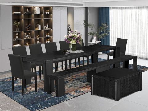 Included packages: A rectangular table, a coffee table, 7 Dining chairs and a wooden bench